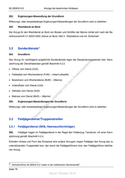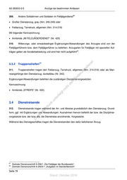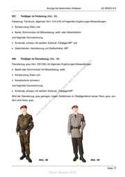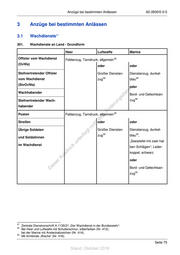 A2-2630/0-0-5 Anzüge bei bestimmten Anlässen 302. Ergänzungen/Abwandlung der Grundform Witterungs- oder einsatzbedingte Ergänzungen/Abwandlungen der Grundform sind zu befehlen. 303. Wachdienst an Bord Der Anzug für den Wachdienst an Bord von Booten und Schiffen der Marine richtet sich nach der Be- reichsvorschrift C1-200/0-3303 „Dienst an Bord, Heft 3 - Wachdienst und mil. Sicherheit“. 3.2 Sonderdienste 60 304. Grundform Den Anzug für nachfolgend aufgeführte Sonderdienste legen die Disziplinarvorgesetzten fest. Kenn- st zeichnung der Diensthabenden gemäß Abschnitt 4.2.3. en sd i • Offizier vom Dienst (OvD) ng ru • Feldwebel vom Wochendienst (FvW) – (Heer/Luftwaffe) de Än • Bootsmann vom Wochendienst (BvW) – (Marine) m de • Unteroffizier vom Dienst (UvD) ht ic • Gefreiter vom Dienst (GvD) tn eg rli • Matrose vom Dienst (MvD) – (Marine) te un 305. Ergänzungen/Abwandlungen der Grundform k uc dr Witterungs- oder einsatzbedingte Ergänzungen/Abwandlungen der Grundform sind zu befehlen. us rA se ie D 3.3 Feldjägerdienst/Truppenstreifen 3.3.1 Feldjägerdienst (SKB, Heeresuniformträger) 306. Feldjäger tragen im Feldjägerdienst in der Regel den Feldanzug, Tarndruck, mit einer Kenn- zeichnung gemäß Abschnitt 4.2.4. Erfordern Anlass und Form des Einsatzes eine andere Anzugart, tragen Feldjäger den Anzug des zu unterstützenden Truppenteils bzw. den durch die Feldjägerführerin bzw. den Feldjägerführer befohle- nen Anzug. 60 Zentralrichtlinie A2-2630/0-0-2 "Leben in der militärischen Gemeinschaft". Seite 76 Stand: Oktober 2016
