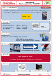 Basishygiene HYG Flächendesinfektion PERFORM® BASIS 5 Wofür nutze ich PERFORM ® HYG BASIS 3.1 Perform® ist ein Flächendesinfektionsmittel (Sauerstoffabspalter) mit breitem Wirkspektrum und gleichzeitiger Reinigungsleistung. Es wird für alle Flächen über 1qm eingesetzt. Flächen > 1qm Dosierung Einwirkzeit Reinigungsmaßnahmen: 1 Beutel = 1% Lösung Kontaminatonsverdacht: 2 Beutel = 2% Lösung Reinigung: keine TBC –Verdacht: 3 Beutel = 3% Lösung Kontamination: 30 Minuten Vorbereitung Anlegen von Schutzhandschuhen und Schutzbrille ! 4 Liter Wasser in den Eimer des Reinigungswagens einfüllen und Beutel gemäß Dosierung einstreuen Durchführung Einmalige Anwendung der Wischtücher. Standzeit Keine Standzeit der Lösung ! Die Lösung ist nach einmaliger Anwendung umgehend zu entsorgen. Entsorgung Lösung > Kanalisation verwendete Tücher > Restmüll Erstellt durch: Freigegeben durch: Seite: Verbindlich für den Einsatzdienst BFRA RN / Stab RD ÄLRD 110
