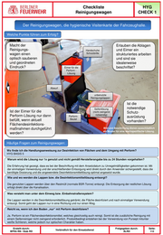 Checkliste HYG Reinigungswagen CHECK 1 Der Reinigungswagen, die hygienische Visitenkarte der Fahrzeughalle. Welche Punkte führen zum Erfolg? Macht der Erlauben die Ablagen Reinigungs- Handschuhe und Eimer ein wagen einen Schutzbrille strukturiertes arbeiten optisch sauberen und sind sie und geordneten idealerweise Eindruck? Eimer für die beschriftet? Perform - Lösung Abwurf unbenutzte Reinigungslappen Ist die Seifenlösung notwendige Ist der Eimer für die (nicht zwingend Schutz- Perform-Lösung nur dann notwendig) Perform- ausrüstung befüllt, wenn aktuell Beutel vorhanden? Flächendesinfektions- maßnahmen durchgeführt Bild und Beschriftung dienen ausschließlich als Muster für eine wachspezifische Lösung. werden? Häufige Fragen zum Reinigungswagen: Wo finde ich die Handlungsanweisung zur Desinfektion von Flächen und dem Umgang mit Perform? HYG BASIS 5 Warum wird die Lösung nur 1x genutzt und nicht gemäß Herstellerangabe bis zu 24 Stunden vorgehalten? Die Erfahrung hat gezeigt, dass es bei der Beschriftung mit dem Ansetzdatum zu Unregelmäßigkeiten gekommen ist. Mit der einmaligen Verwendung und der anschließenden Entsorgung wird direkt durch den Anwender sichergestellt, dass die benötigte Dosierung und die angewendete Desinfektionsmittellösung optimal angesetzt wurde. Wie und wo werden die Lappen bzw. die Desinfektionsmittellösung entsorgt? Die genutzten Lappen werden über den Restmüll (normale BSR-Tonne) entsorgt. Die Entsorgung der restlichen Lösung erfolgt direkt über die Kanalisation. Was versteht man unter dem Einweg bzw. Einbahnstraßensystem? Die Lappen werden in die Desinfektionsmittellösung getränkt, die Fläche desinfiziert und nach einmaliger Verwendung entsorgt. Somit geht der Lappen nur in eine Richtung und nur einen Weg. Reicht es, wenn ich den Boden „nur“ mit Perform desinfiziere? Ja. Perform ist ein Flächendesinfektionsmittel, welches gleichzeitig auch reinigt. Somit ist die zusätzliche Reinigung mit einem Seifenreiniger nicht zwingend erforderlich. Produktbedingt entstehen bei der Verwendung von Pursept mitunter weiße Schlieren, welche jedoch nur optischen Charakter haben. Erstellt durch: Freigegeben durch: Seite: Verbindlich für den Einsatzdienst BFRA RN / Stab RD ÄLRD 112