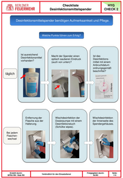 Checkliste HYG Desinfektionsmittelspender CHECK 2 Desinfektionsmittelspender benötigen Aufmerksamkeit und Pflege. Welche Punkte führen zum Erfolg? Ist ausreichend Macht der Spender einen Ist das Desinfektionsmittel optisch sauberen Eindruck Desinfektions- vorhanden? (auch von unten)? mittel mit einem Anbruchdatum ordnungsgemäß beschriftet? täglich 6 Monate Entfernung der Wischdesinfektion der Wischdesinfektion Flasche aus der Dosierpumpe mit einem der Innenseite des Halterung. Desinfektionstuch Spendergehäuses. (Schülke wipes). Bei jedem Flaschen- wechsel Erstellt durch: Freigegeben durch: Seite: Verbindlich für den Einsatzdienst BFRA RN / Stab RD ÄLRD 113