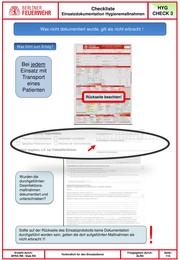 Checkliste HYG Einsatzdokumentation Hygienemaßnahmen CHECK 3 Was nicht dokumentiert wurde, gilt als nicht erbracht ! Was führt zum Erfolg? Bei jedem Einsatz mit Transport eines Patienten Rückseite beachten! Wurden die durchgeführten Desinfektions- maßnahmen dokumentiert und unterschrieben? Sollte auf der Rückseite des Einsatzprotokolls keine Dokumentation durchgeführt worden sein, gelten die dort aufgeführten Maßnahmen als nicht erbracht !!! Erstellt durch: Verbindlich für den Einsatzdienst ! Freigegeben durch: Seite: BFRA RN / Stab RD ÄLRD 114