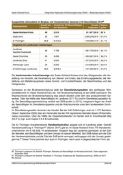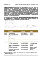 Saale-Holzland-Kreis Integriertes Regionales Entwicklungskonzept (IREK) – Bestandsanalyse 04/2021 Die Kreativwirtschaft hat im Saale-Holzland-Kreis mit einem Anteil von unter 3 % der SvB nur eine untergeordnete Bedeutung. Damit zählt der Landkreis im Vergleich zu anderen Landkreisen und kreisfreien Städten in Thüringen zu denen mit den geringsten Anteilen. Die Potenziale der Kreativ- wirtschaft als Markt- und Innovationstreiber zeigen sich auch in Thüringen erst in geringem Maße. Ziel des Freistaates ist es daher, mit einer Gesamtstrategie für Thüringen diesen Wirtschaftszweig schwerpunktmäßig in den größeren kreisfreien Städten zu stärken. Jena zählt bereits heute zu den 89 Schwerpunkten in Thüringen (Software/-Gameindustrie). Die räumliche Nähe des Saale-Holzland- Kreises zu Jena bietet zugleich Chancen für den Saale-Holzland-Kreis (Motor für die Beschäftigung, Innovationen für andere Wirtschaftsbranche). Die ursprüngliche Wirtschaftsstruktur aus klein- und mittelständisch geprägten Betrieben hat sich bis heute bewahrt. Die große Mehrzahl der 3.476 im Landkreis ansässigen Unternehmen und Arbeitsstätten sind den kleinen und mittleren Unternehmen zuzurechnen: - 86,9 % mit 1–9 Mitarbeitern, - 10,4 % mit 10–49 Mitarbeitern, - 2,4 % mit 50–249 Mitarbeitern und - 0,3 % mit mehr als 250 Mitarbeitern. Der größte Arbeitgeber im Saale-Holzland-Kreis ist die Silbitz Group GmbH mit über 500 Mitarbeitern mit dem Hauptstandort in Silbitz. Alle anderen Unternehmen beschäftigen weniger als 500 Mitarbei- ter. Die Mehrheit der großen Unternehmen befindet sich am Standort Hermsdorf. Größte privatwirtschaftliche Arbeitgeber im Saale-Holzland-Kreis90 Anzahl der Arbeitgeber Firmensitz Branche Mitarbeiter 500–999 Silbitz Group GmbH Silbitz (Hauptsitz) Gießerei 200–499 Micro-Hybrid Electronic GmbH Hermsdorf (Hauptsitz) Elektronik AUTO-SCHOLZ-AVS GmbH & Co. Sulza (Hauptsitz) Automobil KG VACOM Vakuum Komponenten & Großlöbichau (Hauptsitz) Vakuumtechnik Messtechnik GmbH Griesson – de Beukelaer GmbH & Kahla Lebensmittel Co. KG 100–199 Mathys Orthopädie GmbH Mörsdorf (Hauptsitz) Medizinprodukte H.C. Starck Hermsdorf GmbH Hermsdorf (Hauptsitz) Technologie-Metalle und Keramik CERA SYSTEM Verschleißschutz Hermsdorf (Hauptsitz) Keramik GmbH Lust Hybrid-Technik GmbH Hermsdorf (Hauptsitz) Elektronik- und Mikro- systemtechnik Porzellanfabrik Hermsdorf GmbH Hermsdorf (Hauptsitz) Keramik Technische Keramik 89 Vgl. Thüringer Ministerium für Wirtschaft, Arbeit und Technologie (2011): Kreativwirtschaft in Thüringen. Lage, An- satzpunkte, Empfehlungen, S. 15 90 IHK Ostthüringen zu Gera. Unternehmensdatenbank, Stand November 2020 KEM Kommunalentwicklung Mitteldeutschland GmbH Seite 47
