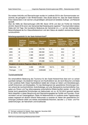 Saale-Holzland-Kreis Integriertes Regionales Entwicklungskonzept (IREK) – Bestandsanalyse 04/2021 Die meisten Ankünfte und Übernachtungen wurden im Landkreis 2019 in den Sommermonaten ver- zeichnet, die geringsten in den Wintermonaten. Dies deutet darauf hin, dass der Saale-Holzland- Kreis insbesondere in der warmen und gemäßigten Jahreszeit ein beliebtes Ausflugs- und Reiseziel darstellt. Über die Hälfte der Übernachtungen (205.188, Stand: 2019) und über ein Fünftel der Ankünfte 97 (22.644, Stand 2019) sind in der Gemeinde Bad Klosterlausnitz registriert. Durchschnittlich bleiben Gäste dort 9,9 Tage. Die touristische Bedeutung der Gemeinde ist u. a. auf den überregionalen Bekanntheitsgrad als Kur-/Gesundheitszentrum und dem Status als staatlich anerkanntes Heilbad zurückzuführen. 98 Beherbergungsstatistik für den Saale-Holzland-Kreis Durch- Durchschnitt- Geöffnete Darunter Angebo- Übernach- schnittliche liche Aufent- Beherber- Auslands- tene Betten tungen Bettenaus- haltsdauer in gungsbe- gäste lastung in % Tagen triebe 2000 55 2.234 345.793 k. A. 42,0 4,3 2005 49 2.199 360.592 6,6 % 45,2 4,0 2010 51 2.065 362.027 4,8 % 47,6 3,7 2015 48 1.984 370.382 5,7 % 49,1 3,8 2019 41 1.814 372.080 5,9 % 53,2 3,6 Vergleich mit anderen Regionen (Stand: 2019) Stadt Jena 31 2.434 370.495 16,5 % 43,3 1,7 Thüringen 1.159 63.029 9.659.665 6% 41,8 2,5 Tourismuswirtschaft Die wirtschaftliche Bedeutung des Tourismus für den Saale-Holzland-Kreis lässt sich nur schwer quantitativ darlegen. Grundsätzlich hängt sie vom Kaufkraftstrom ab, der durch Besucher und Gäste in den Landkreis fließt. Dieser Kaufkraftstrom belebt den Umsatz an Gütern und Dienstleistungen, schafft Einkommen und Arbeitsplätze. Für das Marktsegment der gewerblichen Einrichtungen kön- nen anhand der durchschnittlichen Aufenthaltstage und unter Bezugnahme durchschnittlicher Aus- gaben pro Person und Tag näherungsweise wirtschaftliche Effekte beziffert werden. Im Jahr 2019 konnte durch gewerbliche Einrichtungen ein Nettoumsatz von ca. 40.722.228 € generiert werden. Nicht inbegriffen in dieser Berechnung sind Übernachtungsgäste bei Familie und Freunden, Privat- vermietern und auf Campingplätzen, Gäste mit Nebenwohnsitz im Landkreis sowie Tagestouristen, sodass insgesamt ein deutlich höherer Nettoumsatz zu erwarten ist. Neben den gewerblichen Ein- richtungen profitieren direkt und indirekt verschiedenste Branchen, darunter u. a. Kultur- und Frei- zeiteinrichtungen, der Nahverkehr und Einzelhandel. 97 Thüringer Landesamt für Statistik, Daten abgerufen: November 2020 98 Vgl. ebenda, Daten abgerufen: November 2020 KEM Kommunalentwicklung Mitteldeutschland GmbH Seite 52
