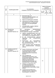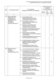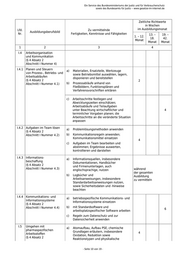 Ein Service des Bundesministeriums der Justiz und für Verbraucherschutz sowie des Bundesamts für Justiz ‒ www.gesetze-im-internet.de Zeitliche Richtwerte in Wochen Lfd. Zu vermittelnde im Ausbildungsmonat Ausbildungsberufsbild Nr. Fertigkeiten, Kenntnisse und Fähigkeiten 13. – 19. – 1. – 12. 18. 42. Monat Monat Monat 1 2 3 4 (§ 4 Absatz 2 b) Grundfunktionen des ausbildenden Abschnitt I Nummer 2) Betriebes wie Beschaffung, Fertigung, Absatz und Verwaltung erklären c) Beziehungen des ausbildenden Betriebes und seiner Beschäftigten zu Wirtschaftsorganisationen, Berufsvertretungen und Gewerkschaften nennen d) Grundlagen, Aufgaben und Arbeitsweisen der betriebsverfassungs- oder personalvertretungsrechtlichen Organe des ausbildenden Betriebes beschreiben I.3 Betriebliche Maßnahmen zum verantwortlichen Handeln (Responsible Care) (§ 4 Absatz 2 Abschnitt I Nummer 3) I.3.1 Sicherheit und a) Gefährdung von Sicherheit und Gesundheitsschutz Gesundheit am Arbeitsplatz feststellen bei der Arbeit und Maßnahmen zu ihrer Vermeidung (§ 4 Absatz 2 ergreifen Abschnitt I Nummer 3.1) b) berufsbezogene Arbeitsschutz- und Unfallverhütungsvorschriften anwenden während c) Verhaltensweisen bei Unfällen der gesamten beschreiben sowie erste Maßnahmen Ausbildung einleiten zu vermitteln d) Vorschriften des vorbeugenden Brandschutzes anwenden; Verhaltensweisen bei Bränden beschreiben und Maßnahmen zur Brandbekämpfung ergreifen e) Aufgaben der zuständigen Berufsgenossenschaft und der für den Arbeitsschutz zuständigen Behörden erläutern f) persönliche Schutzausrüstungen unterscheiden und handhaben g) Sicherheitseinrichtungen am Arbeitsplatz bedienen und ihre Funktionsfähigkeit erhalten h) Explosionsgefahren beschreiben und Maßnahmen zum Explosionsschutz ergreifen - Seite 7 von 19 -