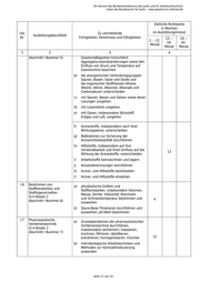 Ein Service des Bundesministeriums der Justiz und für Verbraucherschutz sowie des Bundesamts für Justiz ‒ www.gesetze-im-internet.de Zeitliche Richtwerte in Wochen Lfd. Zu vermittelnde im Ausbildungsmonat Ausbildungsberufsbild Nr. Fertigkeiten, Kenntnisse und Fähigkeiten 13. – 19. – 1. – 12. 18. 42. Monat Monat Monat 1 2 3 4 Abschnitt I Nummer 5) Gesetzmäßigkeiten hinsichtlich Aggregatszustandsänderungen sowie den Einfluss von Druck und Temperatur auf Gasvolumina beachten b) die anorganischen Verbindungsgruppen Säuren, Basen, Salze und Oxide und die organischen Stoffklassen Alkane, Alkene, Alkine, Alkanole, Alkanale und Carbonsäuren unterscheiden c) mit Säuren, Basen und Salzen sowie deren Lösungen umgehen d) mit Lösemitteln umgehen e) mit Gasen, insbesondere Stickstoff, Erdgas und Luft, umgehen f) Arzneistoffe, insbesondere nach ihrer Wirkungsweise, unterscheiden g) Maßnahmen zur Sicherung der Arzneimittelstabilität durchführen h) Hilfsstoffe, insbesondere auf ihre Verwendbarkeit und ihren Einfluss auf die 12 Wirkung der Arzneistoffe, unterscheiden i) Arbeitsstoffe kennzeichnen und lagern j) Ansatzberechnungen durchführen k) Arznei- und Hilfsstoffe bereitstellen l) Arznei- und Hilfsstoffe einsetzen I.6 Bestimmen von a) physikalische Größen und Stoffkonstanten und Stoffkonstanten, insbesondere Volumen, Stoffeigenschaften Masse, Dichte, Viskosität, Brechzahl (§ 4 Absatz 2 und Schmelztemperatur bestimmen und 4 Abschnitt I Nummer 6) auswerten b) Säure-Base-Titrationen durchführen und auswerten; pH-Wert bestimmen I.7 Pharmazeutische a) Grundoperationen der pharmazeutischen Verfahrenstechnik Verfahrenstechnik durchführen, (§ 4 Absatz 2 insbesondere zerkleinern, klassieren, Abschnitt I Nummer 7) trocknen, filtrieren, destillieren, extrahieren, homogenisieren, mischen 12 b) mikrobiologische Arbeitstechniken und Methoden zur Keimzahlreduzierung anwenden - Seite 11 von 19 -