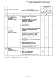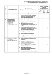Ein Service des Bundesministeriums der Justiz und für Verbraucherschutz sowie des Bundesamts für Justiz ‒ www.gesetze-im-internet.de Zeitliche Richtwerte in Wochen Lfd. Zu vermittelnde im Ausbildungsmonat Ausbildungsberufsbild Nr. Fertigkeiten, Kenntnisse und Fähigkeiten 13. – 19. – 1. – 12. 18. 42. Monat Monat Monat 1 2 3 4 Arzneiformen durchführen, Hilfsstoffe auswählen, Messdaten erfassen und Versuchsergebnisse auswerten II.7 Instandhalten von a) Messgeräte sowie Messwertaufnehmer Fertigungsanlagen justieren und kalibrieren, Ergebnisse sowie Steuerungs- dokumentieren einrichtungen (§ 4 Absatz 2 b) Überwachungs-, Kontroll- und Abschnitt II Nummer 7) Sicherheitseinrichtungen überprüfen und warten c) Anlagen und Anlagenteile einrichten, instandhalten und überprüfen sowie bei 12 Störungen Maßnahmen ergreifen d) Steuerungseinrichtungen prüfen und einstellen e) Steuerungseinrichtungen warten f) Störungen feststellen und Maßnahmen ergreifen II.8 Instrumentelle Analytik a) Proben für analytische Bestimmungen (§ 4 Absatz 2 vorbereiten Abschnitt II Nummer 8) b) Volumetrie mit verschiedenen Indikationsmethoden durchführen c) Gehaltsbestimmungen mit unterschiedlichen chromatografischen 6 Methoden durchführen d) Gehaltsbestimmungen mit unterschiedlichen spektroskopischen Methoden durchführen e) Freisetzungsuntersuchungen durchführen - Seite 15 von 19 -