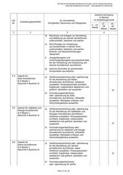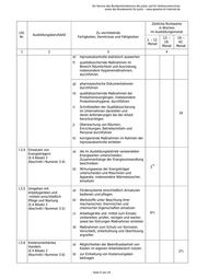 Ein Service des Bundesministeriums der Justiz und für Verbraucherschutz sowie des Bundesamts für Justiz ‒ www.gesetze-im-internet.de Zeitliche Richtwerte in Wochen Lfd. Zu vermittelnde im Ausbildungsmonat Ausbildungsberufsbild Nr. Fertigkeiten, Kenntnisse und Fähigkeiten 13. – 19. – 1. – 12. 18. 42. Monat Monat Monat 1 2 3 4 i) Kennzeichnungen und Kennzeichnungsfarben Behältern und Fördersystemen zuordnen j) Regeln der Arbeitshygiene anwenden k) ergonomische Grundregeln anwenden sowie Maßnahmen zur Erhaltung der Gesundheit und Leistungsfähigkeit ergreifen l) mit Gefahrstoffen umgehen; Gefahren erläutern und vermeiden I.3.2 Umweltschutz Zur Vermeidung betriebsbedingter (§ 4 Absatz 2 Umweltbelastungen im beruflichen Abschnitt I Nummer 3.2) Einwirkungsbereich beitragen, insbesondere a) mögliche Umweltbelastungen durch den Ausbildungsbetrieb und seinen Beitrag zum Umweltschutz an Beispielen erklären b) für den Ausbildungsbetrieb geltende Regelungen des Umweltschutzes anwenden c) Möglichkeiten der wirtschaftlichen und umweltschonenden Energie- und Materialverwendung nutzen d) Abfälle vermeiden; Stoffe und Materialien einer umweltschonenden Entsorgung zuführen I.3.3 Qualitätsmanagement a) Gesetze, Verordnungen sowie Regeln (§ 4 Absatz 2 zur pharmazeutischen Fertigung, Abschnitt I Nummer 3.3) insbesondere Regeln der Guten Herstellungspraxis für Arzneimittel, beachten b) über Grundsätze des Qualitätssicherungssystems in der Arzneimittelherstellung, insbesondere Qualifizierung, Kalibrierung, Validierung, Dokumentation, Standardarbeitsanweisungen und 11 Qualitätskontrolle, Auskunft geben c) Verfahren zur Probenahme und zur Probenvorbereitung für die Inprozesskontrolle und die Qualitätskontrolle unterscheiden, Proben nehmen d) qualitätssichernde Maßnahmen im Bereich Personal, insbesondere Personalhygiene, durchführen - Seite 8 von 19 -