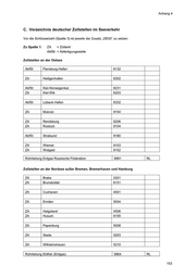 Anhang 4 C. Verzeichnis deutscher Zollstellen im Seeverkehr Vor die Schlüsselzahl (Spalte 3) ist jeweils der Zusatz „DE00“ zu setzen. Zu Spalte 1: ZA = Zollamt AbfSt = Abfertigungsstelle Zollstellen an der Ostsee AbfSt Flensburg-Hafen 6132 ZA Heiligenhafen 6302 AbfSt Kiel-Norwegenkai 6231 ZA Kiel-Wik 6203 AbfSt Lübeck-Hafen 6332 ZA Mukran 9154 ZA Rendsburg 6206 ZA Rostock 9104 AbfSt Stralsund 9180 ZA Wismar 9103 ZA Wolgast 9152 Rohrleitung Erdgas Russische Föderation 9991 RL Zollstellen an der Nordsee außer Bremen, Bremerhaven und Hamburg ZA Brake 5301 ZA Brunsbüttel 6151 ZA Cuxhaven 4501 ZA Emden 5004 ZA Helgoland 4506 ZA Husum 6155 ZA Papenburg 5008 ZA Stade 5203 ZA Wilhelmshaven 5310 Rohrleitung Eldfisk (Erdgas) 9964 RL 153