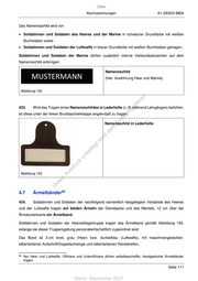 Offen Kennzeichnungen A1-2630/0-9804 Das Namensschild wird von Soldatinnen und Soldaten des Heeres und der Marine in schwarzer Grundfarbe mit weißen Buchstaben sowie Soldatinnen und Soldaten der Luftwaffe in blauer Grundfarbe mit weißen Buchstaben getragen. Soldatinnen und Soldaten der Marine dürfen zusätzlich interne Verbandsabzeichen auf dem Namensschild anbringen. Namensschild (hier: Ausführung Heer und Marine) Abbildung 152 st! en 433. sd i Wird das Tragen eines Namensschildes in Lederhülle (z. B. während Lehrgängen) befohlen, ng ist diese unter der linken Brusttaschenklappe angeknöpft zu tragen.ru de Än Namensschild in Lederhülle m de ht ic tn eg rli te un k uc dr us Abbildung 153 rA se ie D 88 4.7 Ärmelbänder 434. Soldatinnen und Soldaten der nachfolgend namentlich festgelegten Verbände des Heeres und der Luftwaffe tragen auf beiden Ärmeln der Dienstjacke und des Mantels, 12 cm über der Ärmelunterkante ein Ärmelband. Soldatinnen und Soldaten der Heeresfliegertruppe tragen das Ärmelband gemäß Abbildung 155, solange sie dieser Truppengattung personalwirtschaftlich zugeordnet sind. Das Band ist 3 cm breit, grau (Heer) bzw. dunkelblau (Luftwaffe), mit maschinengestickter, silberfarbener Aufschrift/Doppelschwinge und silberfarbenen Randstreifen. 88 Nur Heer und Luftwaffe, Offiziere und Unteroffiziere dürfen selbstbeschaffte, handgestickte Ärmelbänder tragen. Seite 111 Stand: September 2021