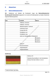 Offen Abzeichen A1-2630/0-9804 5 Abzeichen 5.1 Nationalitätsabzeichen 501. Soldatinnen und Soldaten der Bundeswehr tragen das Nationalitätsabzeichen Bundesrepublik Deutschland waagerecht, 6 cm unter der Ärmeleinsatznaht, auf beiden Oberärmeln folgender Bekleidungsstücke: Heer Luftwaffe Marine Feldbluse, Tarndruck Feldjacke, Tarndruck Nässeschutzjacke, Tarndruck st! en Unterhemd, braun sd i Combat-Shirt SK ng ru Kampfjacke, kurz de Än Kampfjacke, lang m de Jacke zum übergezogenen Nässeschutz ht ic Bordparka tn eg Bordjacke rli te Bordhemd un k 90 Pullover uc dr Panzerkombination us rA Fliegerlederjacke se ie Fliegerkombination D Ausführung: Abbildung 164 Gewebtes Baumwollband in den Bundesfarben Schwarz-Rot-Gold. Größe 5 x 2,5 cm 90 Nicht am Pullover, grau (Heer). Seite 113 Stand: September 2021