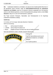 Offen A1-2630/0-9804 Abzeichen 502. Ausländische Soldatinnen und Soldaten, die aufgrund eines Ausbildungshilfe-Abkommens in der Bundeswehr Dienst verrichten, tragen die Nationalitätskennzeichnung für ausländische Soldatinnen und Soldaten, soweit sie mit deutschen Uniformen ausgestattet sind. Die Abzeichen werden an allen Bekleidungsstücken, an denen Dienstgradabzeichen getragen werden, auf dem linken Oberärmel, mittig 3,5 cm unter der Ärmeleinsatznaht, angebracht. Das Tragen deutscher Dienstgrad-, Nationalitäts- oder Hoheitsabzeichen ist für Angehörige ausländischer Streitkräfte unzulässig. Ausführung: 3 cm breites und 10 cm langes, halbrundes Abzeichen in Bandform. Schrift und Umrandung: Heer: weiß auf grauem Grundtuch, ! st en Luftwaffe: weiß auf blauem Grundtuch und sd i Marine: ng goldgelb auf blauem Grundtuch bzw. blau auf weißem Grundtuch. ru de Name des betreffenden Landes in offizieller, deutscher Bezeichnung. Än Abbildung 165 m de Form der Nationalitätskennzeichnung für ht ic tn ausländische Soldatinnen und Soldaten eg (Beispiel) rli te un hier: Ausführung Marine k uc dr us rA se ie D Seite 114 Stand: September 2021