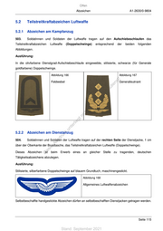 Offen Abzeichen A1-2630/0-9804 5.2 Teilstreitkraftabzeichen Luftwaffe 5.2.1 Abzeichen am Kampfanzug 503. Soldatinnen und Soldaten der Luftwaffe tragen auf den Aufschiebeschlaufen das Teilstreitkraftabzeichen Luftwaffe (Doppelschwinge) entsprechend der beiden folgenden Abbildungen. Ausführung: In die olivfarbene Dienstgrad-Aufschiebeschlaufe eingewebte, stilisierte, schwarze (für Generale goldfarbene) Doppelschwinge. Abbildung 166 Abbildung 167 st ! Feldwebel en Generalleutnant sd i ng ru de Än m de ht ic tn eg rli te un 5.2.2 Abzeichen am Dienstanzug k uc dr 504. Soldatinnen und Soldaten der Luftwaffe tragen auf der rechten Seite der Dienstjacke, 1 cm us rA über der Oberkante der Brusttasche, das Teilstreitkraftabzeichen Luftwaffe (Doppelschwinge). se Dieses Abzeichen ie ist beim Erwerb eines an gleicher Stelle zu tragenden, deutschen D Tätigkeitsabzeichens abzulegen. Ausführung: Stilisierte, silberfarbene Doppelschwinge auf blauem Grundtuch, maschinengestickt. Abbildung 168 Allgemeines Luftwaffenabzeichen Selbstbeschaffte handgestickte Abzeichen dürfen an selbstbeschafften Dienstjacken getragen werden. Seite 115 Stand: September 2021