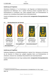 Offen A1-2630/0-9804 Abzeichen Ausführung und Trageweise: Silberfarbene Metallsterne (1,7 cm Durchmesser in der Diagonale) und Metalleichenlaubkränze, entsprechend den Abbildungen, bzw. in gleicher Anordnung schwarze eingewebte Sterne und Eichenlaubkränze im olivfarbenen, bzw. weiße eingewebte Sterne und Eichenlaubkränze im schwarzen bzw. dunkelblauen Baumwollstoff bei den Aufschiebeschlaufen. Anstelle der Metallabzeichen ist das Tragen selbstbeschaffter handgestickter Dienstgradabzeichen gestattet. 511. Dienstgradabzeichen der Generale st ! en sd i ng ru de Än m de ht ic Abbildung 199 Abbildung 200 tn Abbildung 201 Abbildung 202 eg Brigadegeneral Generalmajorrli Generalleutnant General te (hier: Luftwaffe) un (hier: Heer) (hier: Luftwaffe) (hier: Heer) k Generalarzt 96 uc Generalstabsarzt 96 Generaloberstabsarzt 96 dr 96 us Generalapotheker rA se ie Ausführung und Trageweise: D Goldfarbene Metallsterne und Metalleichenlaubkränze in gleicher Form, Abmessung und Anordnung wie die Abzeichen für Offiziere bzw. goldgelb eingewebte Sterne und Eichenlaubkränze im olivfarbenen, schwarzen bzw. dunkelblauen Baumwollstoff bei den Aufschiebeschlaufen. Anstelle der Metallabzeichen ist das Tragen selbstbeschaffter, handgestickter Dienstgradabzeichen gestattet. 96 Zusätzlich ist das jeweils zutreffende Laufbahnabzeichen für Sanitätsoffiziere (Nr. 518) zu tragen. Seite 124 Stand: September 2021