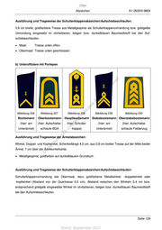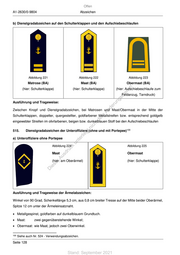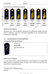 Offen A1-2630/0-9804 Abzeichen Hier ist jeweils die linke Schulterklappe abgebildet: Ä Abbildung Abbildung Abbildung Abbildung Abbildung Abbildung Abbildung 210 211 212 213 214 215 216 Gefreiter Ober Haupt Stabs Oberstabs Korporal Stabs- gefreiter gefreiter gefreiter gefreiter ! korporal st en sd i Ausführung und Trageweise: ng ru de Goldfarbene, nach hinten schräggestellte Metallstreifen bzw. entsprechend goldgelb eingewebte Än Streifen im olivfarbenen, beigen bzw. dunkelblauen Baumwollstoff bei den Aufschiebeschlaufen m entsprechend den Abbildungen. de ht ic tn 513. eg Dienstgradabzeichen der Maatanwärter (MA) 98 rli te a) Dienstgradabzeichen auf den Ärmeln un k uc Abbildung 217 dr us Gefreiter (MA) rA se (hier: linker Oberärmel) ie D Ausführung und Trageweise: 6 cm lange Tresse, Ausführung wie Dienstgradabzeichen der Mannschaften für die entsprechenden Bekleidungsstücke als waagerechter Balken auf beiden Ärmeln unmittelbar über den Dienstgrad- abzeichen oder an entsprechender Stelle. 98 Siehe auch Nr. 524 - Verwendungsabzeichen. Seite 126 Stand: September 2021