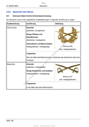 Offen A1-2630/0-9804 Abzeichen 5.9.3 Abzeichen des Heeres 541. Gekreuzte Säbel mit/ohne Eichenlaubumrandung Die Abzeichen sind an den aufgeführten Kopfbedeckungen in folgender Ausführung zu tragen: Kopfbedeckung Ausführung Abbildung Schirmmütze Generale: goldfarben, handgestickt; Übrige Offiziere und Oberfähnriche: silberfarben, handgestickt; Unteroffiziere und Mannschaften: st! hellaltgoldfarben, metallgeprägt. en Abbildung 336 sd i ng (hier: hellaltgoldfarben) ru Trageweise: de Än Über der Mitte des Mützenschirms, Unterkante des Abzeichens über dem m Kinnband. de ht ic Bergmütze Generale: tn eg goldfarben, metallgeprägt; rli te un Übrige Soldatinnen und Soldaten: k hellaltgoldfarben, metallgeprägt. uc dr Abbildung 337 us rA (hier: hellaltgoldfarben) se ie Trageweise: D In der Mitte über dem Mützenschirm. Seite 158 Stand: September 2021