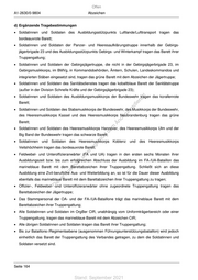 Offen A1-2630/0-9804 Abzeichen d) Ergänzende Tragebestimmungen Soldatinnen und Soldaten des Ausbildungsstützpunkts Luftlande/Lufttransport tragen das bordeauxrote Barett; Soldatinnen und Soldaten der Panzer- und Heeresaufklärungstruppe innerhalb der Gebirgs- jägerbrigade 23 und des Ausbildungsstützpunkts Gebirgs- und Winterkampf tragen das Barett ihrer Truppengattung; Soldatinnen und Soldaten der Gebirgsjägertruppe, die nicht in der Gebirgsjägerbrigade 23, im Gebirgsmusikkorps, im BMVg, in Kommandobehörden, Ämtern, Schulen, Landeskommandos und integrierten Stäben eingesetzt sind, tragen das grüne Barett mit dem Abzeichen der Jägertruppe; Soldatinnen und Soldaten des Sanitätsdienstes tragen das kobaltblaue Barett der Sanitätstruppe (außer in der Division Schnelle Kräfte und der Gebirgsjägerbrigade 23); Soldatinnen und Soldaten des Ausbildungsmusikkorps der Bundeswehr tragen das korallenrote ! st Barett; en sd i Soldatinnen und Soldaten des Stabsmusikkorps der Bundeswehr, des Musikkorps der Bundeswehr, ng ru des Heeresmusikkorps Kassel und des Heeresmusikkorps Neubrandenburg tragen das grüne de Barett; Än m Soldatinnen und Soldaten des Heeresmusikkorps Hannover, des Heeresmusikkorps Ulm und der de Big Band der Bundeswehr tragen das schwarze Barett; ht ic Soldatinnen und Soldaten des Heeresmusikkorps Koblenz und des Heeresmusikkorps tn eg Veitshöchheim tragen das bordeauxrote Barett; rli te Feldwebel- und Unteroffizieranwärter (FA und UA) tragen in den ersten sechs Monaten ihrer un Ausbildungszeit bzw. bis zum erfolgreichen Abschluss der Ausbildung im FA-/UA-Bataillon das k uc marineblaue Barett mit dem Barettabzeichen ihrer Truppengattung. Schließt sich an diese dr us Ausbildung eine Zivil-berufliche Aus- und Weiterbildung an, so ist für die Dauer dieser Ausbildung rA se ebenfalls das marineblaue Barett mit dem Barettabzeichen ihrer Truppengattung zu tragen; ie Offizier-, Feldwebel- und Unteroffizieranwärter ohne zugeordnete Truppengattung tragen das D Barettabzeichen der Jägertruppe; Das Stammpersonal der OA- und der FA-/UA-Bataillone trägt das marineblaue Barett mit dem Barettabzeichen ihrer Truppengattung; Alle Soldatinnen und Soldaten im OrgBer CIR, unabhängig vom Uniformträgerbereich oder einer Truppengattung, tragen das marineblaue Barett mit dem Abzeichen CIR; Alle übrigen Soldatinnen und Soldaten tragen das Barett ihrer Truppengattung; Bis zur Bataillons-/Regimentsebene (ausgenommen Führungsunterstützungsbataillon) wird jedoch einheitlich das Barett der Truppengattung des Verbandes getragen, zu dem die Soldatinnen und Soldaten versetzt sind. Seite 164 Stand: September 2021