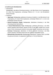 Offen Abzeichen A1-2630/0-9804 e) Ausführung der Barettabzeichen Alle Abzeichen Metallgeprägte, matt-silberne Eichenlaubumrandung; in der Mitte Zeichen für die Truppengattung. Am unteren Rand eingelassenes, rechteckiges Plättchen (0,7 x 1,2 cm) in den Bundesfarben Schwarz-Rot-Gold. Ausnahmen Jägertruppe: Metallgeprägte, goldfarbene Umrandung in Kordelform; in der Mitte Zeichen für die Truppengattung. Am unteren Rand eingelassenes, rechteckiges Plättchen (0,7 x 1,2 cm) in den Bundesfarben Schwarz-Rot-Gold. Deutsch-Französische Brigade: Metallgeprägte, silberfarbene Umrandung; in der Mitte ineinandergreifende Nationalfarben. I. Deutsch-Niederländisches Korps: Metallgeprägte, goldfarbene Umrandung; in der Mitte st! en aufrecht zeigendes (Send-)Schwert, welches am Heft von zwei Seiten umgriffen wird. Auf dem sd i unteren Teil der Umrandung die Aufschrift „Communitate Valemus“ (Gemeinsam sind wir stark). ng ru Eurokorps: Metallgeprägte, silberfarbene, mit Sternen applizierte Umrandung; in der Mitte de Än aufrecht zeigendes, wehrhaftes Schwert über dem symbolisch dargestellten Europa. m Multinationales Korps Nord-Ost: Metallgeprägter, silberfarbener, erhabener Rand; in der Mitte de drei gekreuzte Schwerter mit aufgesetztem Greifenkopf; im Fuß drei Wellenlinien. ht ic tn eg rli te un k uc dr us rA se ie D Seite 165 Stand: September 2021