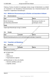 Offen Anzüge bei bestimmten Anlässen A1-2630/0-9804 3.6.2 Gelöbnis/Vereidigung 316. Aufstellung Formation Heer Luftwaffe Marine Fahnenabordnung Anzug gemäß Nr. 327 und Nr. 328 Ehrenzug/ Großer Dienstanzug, Grundform oder Dienstanzug, Grundform mit Ehrenkompanie Feldanzug, Tarndruck, Grundform mit Lederkoppel, schwarz Lederkoppel, schwarz und ggf. mit Gefechtshelm Waffe Abordnungen unter Waffen ! st en tragen Seestiefel mit zwei sd i halben Schlägen. Um ein ng ru einheitliches Uniformbild zu de Än erreichen, kann im Einzelfall m auch für Offiziere und de ht Unteroffiziere „Seestiefel mit ic zwei halben Schlägen“ befohlen tn eg werden. rli Musikkorps te Großer Dienstanzug, Grundform oder Dienstanzug, Grundform mit un Feldanzug, Tarndruck, Grundform mit k Lederkoppel, schwarz uc Lederkoppel, schwarz und ggf. mit dr us Gefechtshelm rA Soldatinnen und se Großer Dienstanzug, Grundform oder Dienstanzug, Grundform ie Soldaten, die D Feldanzug, Tarndruck, Grundform mit vereidigt werden Lederkoppel, schwarz und ggf. mit Gefechtshelm Großer Dienstanzug Fahnenabordnung, Ehrenzug/Ehrenkompanie, Musikkorps, zu vereidigende Soldatinnen und Soldaten ggf. mit Ergänzungen: Mantel, Wollschal und Fingerhandschuhe, allgemein. Ergänzungen zum Dienstanzug für die angetretene Formation sind zu befehlen. Seite 83 Stand: September 2021