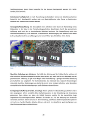 Satellitenmissionen deren Daten kostenfrei für die Nutzung bereitgestellt werden (z.B. NASA: Landsat, ESA: Sentinel). Datenkosten/-verfügbarkeit: Je nach Ausrichtung des Betreibers können die Satellitenaufnahmen kostenfrei (s.o.) bereitgestellt werden oder pro Quadratkilometer oder Szene zu bestimmten, teilweise sehr hohen Kosten verkauft werden. Genauigkeit/Pixelauflösung: Die Genauigkeit einer Aufnahme wird durch die Kantenlänge eines Bildpunktes in der Natur in der Fernerkundungsaufnahme beschrieben. Durch die geometrische Auflösung wird auch der zu beschreibende Bildinhalt bestimmt. Die Pixelauflösung reicht von mehreren Kilometern (z.B. bei Meteosat für kontinentale Anwendungen) über mehrere 10er Meter (z. B Landsat, Sentinel) bis zu Auflösungen unter einem Meter (z.B. WorldView-3 mit 30cm). Abbildung 7: Unterschiedliche Pixelauflösungen und Auswirkung auf die Interpretierbarkeit von Objekten (vlonru: 1km - 5cm). Räumliche Abdeckung pro Aufnahme: Die Größe des Gebietes auf der Erdoberfläche, welches mit einer einzelnen Aufnahme abgedeckt werden kann variiert sehr stark und ist auch Abhängig von der geometrischen Auflösung. Es gilt in der Regel: hohe Pixelauflösung = geringe räumliche Abdeckung pro Aufnahme und umgekehrt. Für flächendeckende, also nationale bzw. regionale Anwendungen sind große räumliche Abdeckungen von Vorteil da sie mit einer einzigen Aufnahme unter denselben atmosphärischen Aufnahmebedingungen große Gebiete erfassen können. Sonstige Eigenschaften (z.B. Kanäle, Sensortyp): Neben optischen Erdbeobachtungssatelliten sind in den vergangenen Jahren verstärkt aktive Aufnahmesysteme in die Entwicklung und Anwendung gekommen. Dazu zählen vor allem die RADAR Sensoren welche für das menschliche Auge ungewohnte Rückstreueigenschaften abbilden. Sie werden u.a. für die Messung von Strukturen verwendet. Daneben stehen Sensoren in der Entwicklung, welche das elektromagnetische Spektrum mit mehreren Hundert Kanälen abtasten können und somit eine detaillierte spektrale Signatur von Oberflächenmaterialien erstellen können. 20