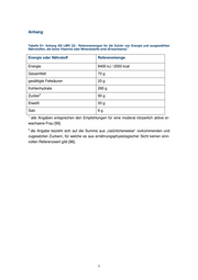 Anhang Tabelle S1: Anhang XIII LMIV [3] - Referenzmengen für die Zufuhr von Energie und ausgewählten 1 Nährstoffen, die keine Vitamine oder Mineralstoffe sind (Erwachsene) Energie oder Nährstoff Referenzmenge Energie 8400 kJ / 2000 kcal Gesamtfett 70 g gesättigte Fettsäuren 20 g Kohlenhydrate 260 g 2 Zucker 90 g Eiweiß 50 g Salz 6g 1 alle Angaben entsprechen den Empfehlungen für eine moderat körperlich aktive er- wachsene Frau [95] 2 die Angabe bezieht sich auf die Summe aus „natürlicherweise“ vorkommenden und zugesetzten Zuckern, für welche es aus ernährungsphysiologischer Sicht keinen sinn- vollen Referenzwert gibt [96]. I