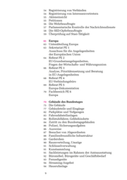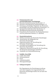 223 Parlamentarische und parlamentsbezogene Vereinigungen 225 Deutsche Parlamentarische Gesellschaft e. V. 226 Deutsche Vereinigung für Parlamentsfragen e. V. 226 Vereinigung ehemaliger Mitglieder des Deutschen Bundestages und des Europäischen Parlaments e. V. 227 Sportgemeinschaft Deutscher Bundestag e. V. 228 Musikgemeinschaft Deutscher Bundestag 229 Kommission für Geschichte des Parlamentarismus und der politischen Parteien e. V. (KGParl) 231 Zusatzinformationen 233 Telefonverzeichnis des Deutschen Bundestages 233 Verzeichnisse der Mitglieder des Deutschen Bundestages 234 Organisationsplan der Verwaltung des Deutschen Bundestages 234 Geschäftsverteilungsplan der Verwaltung des Deutschen Bundestages 234 Allgemeine Dienstanweisung für die Verwaltung des Deutschen Bundestages (AD-BTV) 234 Auskünfte zur Parteienfinanzierung 237 Notfälle, Erste Hilfe 239 Unfall, Erste Hilfe 240 Parlamentsärztin 240 Feuer 241 Cyberkriminalität 242 Störungsmeldungen 245 Schlagwortregister Ein Organigramm der Bundestagsverwaltung und einen Lageplan der Liegenschaften des Deutschen Bundestages finden Sie am Ende des Dokuments. 14