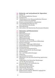 159 Recherche- und Analysedienste für Abgeordnete 161 Hotline W 161 Die Wissenschaftlichen Dienste 164 Fachbereiche 167 Vernetzung mit den Wissenschaftlichen Diensten anderer Parlamente (EZPWD) 168 Externe wissenschaftliche Dienstleister 168 Technikfolgenabschätzung (TA) beim Deutschen Bundestag 169 Sprachberatung 170 Servicebüro des Statistischen Bundesamts (Destatis) 173 Information und Dokumentation 175 Bibliothek 176 Bibliotheksbestand 176 Katalog / Ausleihe 177 Digitale Bibliothek 177 Bibliothekslesesäle 178 Information und Beratung 178 Aktuelle Literaturverzeichnisse (Bibliothek) 179 Buchausstellungen 179 Schulungen / Führungen (Bibliothek) 179 Präsenzbibliothek im Reichstagsgebäude 180 Parlamentsarchiv 180 Lesesaal des Parlamentsarchivs 181 Akten und Protokolle des Bundestages 181 Bilddatenbank 181 Ton- und Videoaufzeichnungen 182 Webarchiv 182 Gesetzesdokumentation 182 Öffentliche Liste der beim Bundestag registrierten Verbände 183 Lobbyregister des Deutschen Bundestages und der Bundesregierung 183 Datenhandbuch zur Geschichte des Deutschen Bundestages 183 Parlamentsdokumentation 184 Thematische Recherche 184 Sach- und Sprechregister 185 Elektronische Volltexte öffentlich zugänglicher Parlamentsmaterialien 12