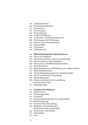 185 Auskunftsdienst 186 Pressedokumentation 187 Pressearchiv 188 Pressemappe 188 Pressedossiers 188 E-Mail-Profildienst 189 Auskunfts- und Rechercheservice 189 Schulungen und Führungen 189 Presse- und Zeitungslesesaal 189 Internetlinks 190 Newsletter 190 Publikationen 193 Öffentlichkeitsarbeit, Besucherdienst 195 Presse und Medien 197 Informationsdienst „heute im bundestag“ 198 Wochenzeitung „Das Parlament“ 198 Information und Öffentlichkeitsarbeit 199 Besucherdienst 199 Besuchergruppen auf Einladung von Abgeordneten 201 Öffentlichkeitsarbeit 206 Veranstaltungsmanagement, Sonderprojekte 208 Kunst im Deutschen Bundestag 209 Mauer-Mahnmal 209 Parlamentshistorische Ausstellung im Deutschen Dom 211 Jugendprojekte 213 Sonstige Einrichtungen 215 Gastronomie 217 Kindertagesstätte 218 Fundbüro 219 Grippeschutzimpfung, Coronapandemie 219 Bundestagsshop 219 Parlamentsbuchhandlung 220 Religiöse Ansprechpartner (katholisch und evangelisch) 220 Sparkassen und Banken 221 Nahverkehr 221 Taxi 13