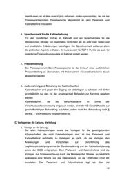 beeinflussen, so ist dies unverzüglich mit einem Änderungsvorschlag, der mit der Pressesprecherin/dem Pressesprecher abgestimmt ist, dem Parlament- und Kabinettreferat mitzuteilen. 6. Sprechvermerk für die Kabinettsitzung Für den mündlichen Vortrag im Kabinett sind ein Sprechvermerk für die Ministerin/den Minister von regelmäßig nicht mehr als ein oder zwei Seiten und evtl. zusätzliche Erläuterungen beizufügen. Der Sprechvermerk sollte vor allem die politischen Aspekte enthalten. Er muss sowohl für TOP 1-Punkte als auch für ordentliche Tagesordnungspunkte im Kabinett erstellt werden. 7. Pressemitteilung Der Pressesprecherin/Dem Pressesprecher ist der Entwurf einer ausführlichen Pressemitteilung zu übersenden; mit ihrem/seinem Einverständnis kann davon abgesehen werden. 8. Aufbewahrung und Sicherung der Kabinettsachen Kabinettsachen sind gegen den Zugang von Unbefugten zu schützen und dürfen grundsätzlich nur den mit der Angelegenheit Befassten zur Kenntnis gegeben werden. Kabinettsachen, die als Verschlusssache im Sinne der Verschlusssachenanweisung eingestuft werden, sind der VS-Geschäftsstelle zur geschäftsmäßigen Behandlung zuzuleiten, sofern nicht ihre Behandlung nach § 26 Abs. 1 VS-Anweisung vorgeschrieben ist. C. Vorlagen an die Leitung, Verteilung 1. Vorlage an die Leitung Bei allen Kabinettvorlagen sowie bei Vorlagen für die gesetzgebenden Körperschaften, die nicht Kabinettvorlagen sind, ist das Parlament- und Kabinettreferat rechtzeitig zu beteiligen; es prüft, ob die Vorlagen den Anweisungen und Vorschriften zur Durchführung des Legislaturperiodenprogramms der Bundesregierung und der Kabinettzeitplanung sowie der GGO entsprechen. Dem Parlament- und Kabinettreferat sind die Vorlagen zur Schlusszeichnung durch die Ministerin/den Minister grundsätzlich spätestens eine Woche vor der Übersendung an die Chefin/den Chef BK zuzuleiten. Das Parlament- und Kabinettreferat legt sie über die 24