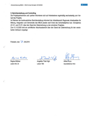 Zielvereinbarung MBJS — RAA für das Schuljahr 2019/2020 5. Berichterstattung und Controlling Die Projektpartnerinnen und -partner informieren sich auf Arbeitsebene regelmäßig wechselseitig zum Ver- lauf des Projekts. Im Rahmen der kontinuierlichen Berichterstattung informiert der Arbeitsbereich Regionale Arbeitsstellen für Bildung, Integration und Demokratie das MBJS jeweils nach Ende des Schulhalbjahres bzw. Schuljahres (31.01. und 31.07.) über den Stand der Zielerreichung zu den einzelnen Projekten. Zum 31.10.2020 wird ein schriftlicher Abschlussbericht über den Stand der Zielerreichung für den verein- barten Zeitraum vorgelegt. Potsdam, den 7.08.2019 Ayına Neahre Js: lu -V. J Regina Büttner Angelika Thiel-Vigh Alfred Roos Leiterin Ref. 26 Leiterin TBB Geschäftsführer RAA