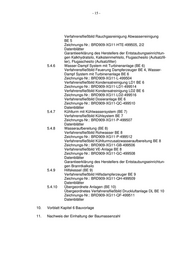 - 15 - Verfahrensfließbild Rauchgasreinigung Abwasserreinigung BE 5 Zeichnungs-Nr.: BRD909-XG11-HTE-499505, 2/2 Datenblätter Garantieerklärung des Herstellers der Entstaubungseinrichtun- gen Kalkhydratsilo, Kalksteinmehlsilo, Flugaschesilo (Aufsatzfil- ter), Flugaschesilo (Aufsatzfilter) 5.4.6 Wasser-Dampf System mit Turbinenanlage (BE 6) Verfahrensfließbild Feuerung Dampferzeuger BE 4, Wasser- Dampf System mit Turbinenanlage BE 6 Zeichnungs-Nr.: BRD909-XG11-L-499504 Verfahrensfließbild Kondensatreinigung LD1 BE 6 Zeichnungs-Nr.: BRD909-XG11-LD1-499514 Verfahrensfließbild Kondensatreinigung LD2 BE 6 Zeichnungs-Nr.: BRD909-XG11-LD2-499516 Verfahrensfließbild Dosieranlage BE 6 Zeichnungs-Nr.: BRD909-XG11-QC-499510 Datenblätter 5.4.7 Kühlturm mit Kühlwassersystem (BE 7) Verfahrensfließbild Kühlsystem BE 7 Zeichnungs-Nr.: BRD909-XG11-P-499507 Datenblätter 5.4.8 Wasseraufbereitung (BE 8) Verfahrensfließbild Rohwasser BE 8 Zeichnungs-Nr.: BRD909-XG11-P-499512 Verfahrensfließbild Kühlturmzusatzwasseraufbereitung BE 8 Zeichnungs-Nr.: BRD909-XG11-GB-499506 Verfahrensfließbild VE-Anlage BE 8 Zeichnungs-Nr.: BRD909-XG11-GC-499508 Datenblätter Garantieerklärung des Herstellers der Entstaubungseinrichtun- gen Branntkalksilo 5.4.9 Hilfskessel (BE 9) Verfahrensfließbild Hilfsdampferzeuger BE 9 Zeichnungs-Nr.: BRD909-XG11-QH-499509 Datenblätter 5.4.10 Übergeordnete Anlagen (BE 10) Übergeordnetes Verfahrensfließbild Druckluftanlage DL BE 10 Zeichnungs-Nr.: BRD909-XG11-QF-499511 Datenblätter 10. Vorblatt Kapitel 6 Bauvorlage 11. Nachweis der Einhaltung der Baumassenzahl