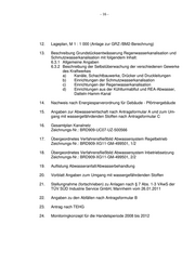 - 16 - 12. Lageplan, M 1 : 1 000 (Anlage zur GRZ-/BM2-Berechnung) 13. Beschreibung Grundstücksentwässerung Regenwasserkanalisation und Schmutzwasserkanalisation mit folgendem Inhalt: 6.3.1 Allgemeine Angaben 6.3.2 Beschreibung der Selbstüberwachung der verschiedenen Gewerke des Kraftwerkes a) Kanäle, Schachtbauwerke, Drücker und Druckleitungen b) Einrichtungen der Schmutzwasserkanalisation c) Einrichtungen der Regenwasserkanalisation d) Einrichtungen aus der Kühlturmabflut und REA-Abwasser, Datteln-Hamm-Kanal 14. Nachweis nach Energiesparverordnung für Gebäude - Pförtnergebäude 15. Angaben zur Abwasserwirtschaft nach Antragsformular A und zum Um- gang mit wassergefährdenden Stoffen nach Antragsformular C 16. Gesamtplan Kanalnetz Zeichnungs-Nr.: BRD909-UC07-UZ-500566 17. Übergeordnetes Verfahrensfließbild Abwassersystem Regelbetrieb Zeichnungs-Nr.: BRD909-XG11-GM-499501, 1/2 18. Übergeordnetes Verfahrensfließbild Abwassersystem Inbetriebsetzung Zeichnungs-Nr.: BRD909-XG11-GM-499501, 2/2 19. Auflistung Abwasseranfall/Abwasserbehandlung 20. Vorblatt Angaben zum Umgang mit wassergefährdenden Stoffen 21. Stellungnahme (fortschrieben) zu Anlagen nach § 7 Abs. 1-3 VAwS der TÜV SÜD Industrie Service GmbH, Mannheim vom 26.01.2011 22. Angaben zu den Abfällen nach Antragsformular B 23. Antrag nach TEHG 24. Monitoringkonzept für die Handelsperiode 2008 bis 2012
