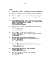 - 17 - Ordner 2 25. Vorblatt Kapitel 10 Phase 1: Erprobung/Prüfung vor dem Inverkehrbringen 26. Betätigung der Durchführung einer Gefährdungsbeurteilung für Phase 1 27. Gutachterliche Äußerung nach § 13 Abs. 2 BetrSichV zur Betriebsgeneh- migung des TÜV Rheinland Industrie Service GmbH, Wuppertal vom 04.02.2011 28. Beschreibung zum Antrag auf Erlaubnis zur Errichtung und zum Betrieb einer Landdampfkesselanlage und zum Betrieb einer Landdampfkesselan- lage mit einem Dampferzeuger der Gruppe IV Herstell-Nr.: B-5411B84-1 Formular Beschreibung HDE 9.93 29. Beschreibung der Aufstellung und der baulichen Anlage für Landdampf- kessel Herstell-Nr.: B-5411B84-1 Formular Beiblatt AOL 9.93 30. Beschreibung des unabsperrbaren Zwischenüberhitzers Herstell-Nr.: B-5411B84HAH30/41/42/61/62/81/82 für den Dampfkessel Herstell-Nr.: B-5411B84-1 Formular Beiblatt 31. Beschreibung des unabsperrbaren Zwischenüberhitzers Herstell-Nr.: B-5411B84HAJ10/11/12/31/32 für den Dampfkessel Herstell-Nr.: B-5411B84-1 Formular Beiblatt AUE 9.93 32. Beschreibung des unabsperrbaren Abgas-Wasservorwärmers Herstell-Nr.: B-5411B84 HAC10/30 AC001 für den Dampfkessel II bis IV Herstell-Nr.: B-5411B84-1 Formular Beiblatt AWV 98.93 33. Beschreibung der Heizöl-Lagerung für den Dampfkessel Herstell-Nr.: B-5411B84-1 Formular Beschreibung LOE 9.93 34. Beschreibung der Ölfeuerungsanlage für den Dampfkessel Herstell-Nr.: B-5411B84-1 Beiblatt FOE 9.93
