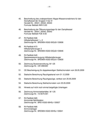 - 19 - 45. Beschreibung des unabsperrbaren Abgas-Wasservorwärmers für den Dampfkessel der Gruppen II bis IV Herstell-Nr.: 20541; 20542; 20543 Formular Beiblatt AWV 9.93 46. Beschreibung der Ölfeuerungsanlage für den Dampfkessel Herstell-Nr.: 20541; 20542; 20543 Formular Beiblatt FOE 9.93 47. RI-Fließbild A06 Hilfsdampfkessel 1 + 2 Zeichnungs-Nr.: BRD909-XG02-00QLB-130606 48. RI-Fließbild A73 Hilfsdampferzeuger 3 Zeichnungs-Nr.: BRD909-XG02-03QLB-130646 49. RI-Fließbild A45 Speisewassererzeugung Hilfsdampferzeuger Zeichnungs-Nr.: BRD909-XG02-00QLA-130630 50. Zeichnung Stutzenanordnung, M 1:25 Zeichnungs-Nr.: OK128033D 51. CE-Bescheinigung für doppelwandigen Stahlschornstein vom 26.05.2009 52. Statische Berechnung Rauchgaskanal vom 01.12.2009 53. Statische Berechnung Rauchgaszüge, vertikal vom 25.05.2009 54. Statische Berechnung Stahlschornstein vom 25.05.2009 55. Hinweis auf nicht noch einmal beigefügte Unterlagen 56. Zeichnung Ammoniakbehälter, M 1:25 Zeichnungs-Nr.: 10-5575-001 57. RI-Fließbild A65 Ammoniak Befüllstation Zeichnungs-Nr.: BRD-XG02-00HSJ-130637 58. RI-Fließbild A66 Ammoniaklager Zeichnungs-Nr.: BRD909-XG02-00HSJ-130641