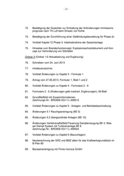 - 21 - 72. Bestätigung der Gutachter zur Einhaltung der Anforderungen Immissions- prognose nach TA Luft beim Einsatz von Kohle 73. Bestätigung der Durchführung einer Gefährdungsbeurteilung für Phase 2c 74. Vorblatt Kapitel 12 Phase 3: Inbetriebnahme der Gesamtanlage 75. Hinweise zum Brandschutzkonzept, Explosionsschutzdokument und Kon- zept zur Verhinderung von Störfällen Ordner 3 (Ordner 1/2 Aktualisierung und Ergänzung) 76. Schreiben vom 24. Juni 2013 77. Inhaltsverzeichnis 78. Vorblatt Änderungen zu Kapitel 3 - Formular 1 79. Antrag vom 27.06.2013, Formular 1, Blatt 1 und 2 80. Vorblatt Änderungen zu Kapitel 4 - Formulare 2 - 6 81. Formulare 2 - 6 (Änderungen gelb markiert, Ergänzungen), 59 Blatt 82. Grundfließbild mit Zusatzinformationen Zeichnungs-Nr.: BRD909-XG11-L-499515 83. Vorblatt Änderungen zu Kapitel 5 - Anlagen- und Betriebsbeschreibung 84. Änderungen 5.1 Rauchgasreinigung (BE 5) 85. Änderungen 5.2 übergeordnete Anlagen (BE 10) 86. Änderungen Verfahrensfließbild Feuerung Dampferzeugung BE 4, Was- ser-Dampf System mit Turbinenanlage BE 6 Zeichnungs-Nr.: BRD909-XG11-L-499504 87. Vorblatt Änderungen zu Kapitel 6 (Bauvorlagen) 88. Neuberechnung der GRZ und BMZ allein für das Kraftwerksgrundstück im B-Plan 80 89. Baulastvereinigung mit Firma microca GmbH
