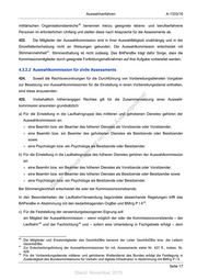Auswahlverfahren A-1333/16 40 militärischen Organisationsbereiche benennen hierzu geeignete lebens- und berufserfahrene Personen im erforderlichen Umfang und stellen diese nach Absprache für die Assessments ab. 423. Die Mitglieder der Auswahlkommission sind in ihrer Auswahltätigkeit unabhängig und in der Einzelfallentscheidung nicht an Weisungen gebunden. Die Auswahlkommission entscheidet mit 41 Stimmenmehrheit . Stimmenthaltung ist nicht zulässig. Das BAPersBw trägt dafür Sorge, dass die Kommissionsmitglieder durch geeignete Fortbildungsmaßnahmen auf ihre Aufgabe vorbereitet werden. 4.3.2.2 Auswahlkommission für zivile Assessments 424. Soweit die Rechtsverordnungen für die Durchführung von Vorbereitungsdiensten Vorgaben zur Besetzung von Auswahlkommissionen für die Einstellung in einen Vorbereitungsdienst enthalten, sind diese anzuwenden. st! 425. Vorbehaltlich höherrangigen Rechtes gilt für die Zusammensetzung einer Auswahl- en kommission ansonsten grundsätzlich: di gs ru n a) Für die Einstellung in die Laufbahngruppe des mittleren und gehobenen Dienstes gehören der de Auswahlkommission an: Än + eine Beamtin bzw. ein Beamter des höheren Dienstes als Vorsitzende oder Vorsitzender, em td + eine Beamtin bzw. ein Beamter des gehobenen Dienstes als Beisitzende oder Beisitzender ic h sowie tn + eine Psychologin bzw. ein Psychologe als Beisitzende oder Beisitzender. eg terli b) Für die Einstellung in die Laufbahngruppe des höheren Dienstes gehören der Auswahlkommission un an: k us + eine Beamtin bzw. ein Beamter des höheren Dienstes als Vorsitzende oder Vorsitzender, druc + eine Beamtin bzw. ein Beamter des höheren Dienstes als Beisitzende oder Beisitzender sowie er A + eine Psychologin bzw. ein Psychologe als Beisitzende oder Beisitzender. ie s D Bei Stimmengleichheit entscheidet die oder der Kommissionsvorsitzende. In den Besonderheiten der Laufbahn/Verwendung begründete abweichende Regelungen trifft das 42 BAPersBw in Abstimmung mit den bedarfstragenden OrgBer und BMVg P I 4 . c) Für die Feststellung der verwendungsbezogenen Eignung soll ein Mitglied der Auswahlkommission – wenn möglich der oder die Kommissionsvorsitzende – der 43 44 Laufbahn und der Fachrichtung und – sofern eine Unterteilung in Fachgebiete erfolgt – dem 40 Die Mitglieder und Ersatzmitglieder des GeoInfoDBw benennt der Leiter GeoInfoDBw bzw. die Leiterin GeoInfoDBw. 41 Zur Entscheidungsfindung der Auswahlkommissionen für mil. Assessments siehe Nr. 427 ff., insbes. Nr. 429. 42 Für die Vorbereitungsdienste mittlerer und gehobener Wetterdienst des Bundes erfolgt die Festlegung in Zuständigkeit des Bundesministeriums für Verkehr und digitale Infrastruktur in Abstimmung mit BMVg P I 4. Seite 17 Stand: November 2015