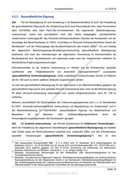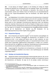 Auswahlverfahren A-1333/16 56 436. Ist eine Eignung mit Auflagen gegeben, ist die Einhaltung der Auflage bei erfolgter Einstellung der Bewerberin bzw. des Bewerbers durch die zuständige Truppen- oder Personalärztin bzw. den zuständigen Truppen- oder Personalarzt zu überwachen. Dies erfordert eine enge Zusammenarbeit zwischen dem Ärztlichen Dienst der PersGOrg Bw, der personalbearbeitenden Stelle und dem Truppen-/Personalärztlichen Dienst der Bundeswehr. Das Nähere regelt das BAPersBw. 437. Die Gültigkeitsdauer für die ärztliche Untersuchung als Grunduntersuchung im Assessment für militärische Verwendungen richtet sich grundsätzlich nach der ZDv 46/1 (zukünftig A1 831/0-4000, Abschnitt 1.2.4). Danach ist bei Bewerberinnen und Bewerbern, die innerhalb der letzten zwölf Monate bereits an einer vollständigen Grunduntersuchung teilgenommen haben, eine Befragung ausreichend. Liegt diese Untersuchung mehr als zwölf und längstens 24 Monate zurück, ist eine auf ! wenige Schritte reduzierte umfangsbegrenzte Untersuchung durchzuführen. Bei gegebener Indikation st en bzw. nach Ablauf von 24 Monaten ist eine Neubewertung des Gesundheitszustandes erforderlich. di gs Gleiches gilt für Bewerberinnen und Bewerber aus ru der Bundeswehr. Für die n Beamteneignungsuntersuchung ist diese Vorgabe analog anzuwenden. de Än 4.3.4 Körperliche Eignung em td 57 438. Bei der Überprüfung der körperlichen Eignung ic sind die körperliche Leistungsfähigkeit, die h Belastbarkeit und die individuelle Trainierbarkeit der Bewerberinnen und Bewerber für eine tn eg Einstellung als SaZ, in eine Laufbahn der Reserve sowie für zivilen Laufbahnen, die einen terli besonderen Anspruch an die körperliche Fitness stellen (z. B. feuerwehrtechnischer Dienst) in einem un speziell hierauf ausgerichteten Assessmentmodul (Fitness-Modul) zu ermitteln und zu bewerten. k us Dieses Modul gibt über die Ergebnisse der allgemeinen Beamteneignungs-/Annahmeuntersuchung druc hinaus Aufschluss über die körperliche Eignung der Bewerberin bzw. des Bewerbers. er A 439. Ausgenommen vom Fitness-Modul sind die Bewerberinnen und Bewerber, die durch das ie s Kommando Streitkräftebasis (KdoSKB) für den Dienst in einer Sportfördergruppe der Streitkräfte D 58 vorgeschlagen werden . 4.3.5 Geistige und charakterliche Eignung 440. Abgestimmte laufbahn-/verwendungsbezogene Anforderungsprofile (siehe Nrn. 405, 418 und 419) bilden die Bewertungsgrundlagen für die Feststellung der geistigen und charakterlichen Eignung aller Bewerberinnen und Bewerber. Sie legen die für die jeweilige Laufbahn fachrichtungs-/ 56 Z. B. Gewichtsreduktion innerhalb einer zu bestimmenden Frist. 57 Das diesbezügliche Anforderungsprofil ist mit den bedarfstragenden OrgBer, den Fachbereichen und der Personalführung abzustimmen. 58 BMVg Fü S I 5 – Az 01-52-40 vom 20. April 2011 „Regelungen für die Förderung von Spitzensportlerinnen und Spitzensportlern in der Bundeswehr“ VMBl 2011 S. 27 – künftig Zentralvorschrift A1-224/0-… Seite 21 Stand: November 2015