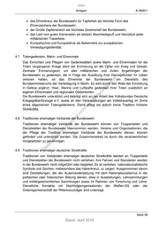 Offen Anlagen A-2600/1 4.14 Militärmusik Militärmusik dient dem Ausgestalten dienstlicher und öffentlicher Veranstaltungen und damit der Repräsentation der Bundeswehr im In- und Ausland. Sie pflegt überliefertes Kulturgut. Die Begleitung mit Militärmusik entspricht militärischer Gepflogenheit und ist Teil des Zeremoniells der Bundeswehr. Das Singen in der militärischen Gemeinschaft ist ein alter Brauch, der bewahrt werden soll. Das Liedgut der Bundeswehr ist ein wichtiger Teil ihrer Identität. Es unterliegt der Wertebindung der Traditionspflege in der Bundeswehr (vgl. 3.1). 4.15 Traditionsnamen Das Benennen von Liegenschaften, Kasernen und Verbänden/Dienststellen stärkt die Identifikation und ist Teil der Traditionspflege der Bundeswehr. Das Verfahren zum Benennen und Umbenennen von Liegenschaften und Kasernen ist in der ZDv A-2650/2 t. festgelegt und bedarf der abschließenden Genehmigung durch das Bundesministerium ns ie der Verteidigung. Über das Benennen von Verbänden und Dienststellen entscheiden die sd Inspekteure bzw. Inspekteurinnen oder die Leiter bzw. Leiterinnen des betroffenen ng Organisationsbereiches. ru de Bestehende Benennungen müssen diesem Traditionserlass entsprechen. Bei Än erforderlichen Überprüfungen und Umbenennungen ist das Zentrum für m Militärgeschichte und de Sozialwissenschaften der Bundeswehr über das ic Bundesministerium der Verteidigung einzubeziehen. ht tn 4.16 Beratung eg terli Als Ansprechstelle für militärhistorischen Rat unterstützt das Zentrum für un Militärgeschichte und Sozialwissenschaften der Bundeswehr die verantwortlichen k uc Vorgesetzten im Umgang mit historischen Ausstellungs- und Erinnerungsstücken. dr Außerdem verfügen die militärischen Kommando-behörden, Bundesämter und Schulen/ us rA Ausbildungseinrichtungen über Historiker bzw. Historikerinnen, die bei se militärhistorischen Fragen im Zusammenhang mit der Traditionspflege fachlich beraten ie sollen. D *** Seite 41 Stand: April 2018