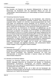 Offen A-2600/1 Anlagen 4.10 Museumswesen Das Darstellen und Bewahren der deutschen Militärgeschichte in Museen und Sammlungen der Bundeswehr dient der historischen Bildung und auch der Traditionspflege. Geschichtsdarstellung und Traditionspflege sind deutlich voneinander abzugrenzen. 4.11 Verwendung historischer Exponate Dokumente und Ausrüstungsgegenstände aus der Bundeswehr, etwa Uniformen, Sockelfahrzeuge oder Truppenfahnen aufgelöster Verbände, dürfen gesammelt und ausgestellt werden. Objekte (z.B. Uniformen, Ausrüstungs-gegenstände oder Orden) sowie Bilder und Darstellungen früherer Streitkräfte, die zur fachlichen Aus- und Weiterbildung genutzt werden, der historischen Unterweisung oder der Ausschmückung dienen, müssen durch die Betrachter in ihren historischen Kontext einzuordnen sein. t. Das Ausschmücken von Diensträumen mit Exponaten und Darstellungen aus der ns ie Wehrmacht und der NVA ist außerhalb von Ausstellungen in Militärgeschichtlichen sd Sammlungen grundsätzlich nicht gestattet, sofern es sich nicht um traditionsstiftende ng ru Persönlichkeiten im Sinne von 3.3 handelt. Ausnahmen von dieser Festlegung kann der de bzw. die nächste Disziplinarvorgesetzte genehmigen, wenn ein Bezug der Exponate zur Än betroffenen Einheit oder eine persönliche Bindung gegeben ist (z.B. Bilder enger m de Familienangehöriger). Die Ausgestaltung darf den Vorgaben dieses Erlasses nicht ic widersprechen. Im Zweifel und bei Fragen ist die Ansprechstelle für militärhistorischen ht Rat des Zentrums für Militärgeschichte und Sozialwissenschaften hinzuzuziehen. tn eg Waffen, Sockelfahrzeuge und Munition sind nur schieß- oder funktionsunfähig terli auszustellen. Kulturgüter, also besonders bewahrens- oder schützenswerte Objekte, un müssen hingegen in ihrem historischen Zustand verbleiben. k uc 4.12 Denkmalschutz dr us rA Historischer Bauschmuck in Kasernen und Liegenschaften sowie an Gebäuden der se Bundeswehr ist nicht Gegenstand der Traditionspflege. Als historische Artefakte ist ihr ie Erhalt dennoch anzustreben. Eine historische Einordnung, z.B. durch eine D Informationstafel, ist erforderlich. Denkmäler in Kasernen müssen den Richtlinien dieses Erlasses entsprechen. 4.13 Diensteid und Feierliches Gelöbnis Diensteid und Feierliches Gelöbnis unter Anteilnahme der Bevölkerung sind ein öffentlich abgelegtes Bekenntnis der Soldatinnen und Soldaten zur freiheitlichen demokratischen Grundordnung. Vereidigungen und Feierliche Gelöbnisse im öffentlichen Raum sind Ausdruck der gesellschaftlichen Verankerung der Bundeswehr und gewachsener Teil ihrer Tradition. Mit dem Feierlichen Gelöbnis am 20. Juli in Berlin ehrt die Bundeswehr den militärischen Widerstand gegen das NS-Regime und bekundet dessen herausgehobene Bedeutung für die Tradition der Bundeswehr. Seite 40 Stand: April 2018