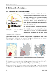 Einführende Informationen 2 Einführende Informationen 2.1 Vorstellung des Landkreises Rottweil Im Landkreis Rottweil, südlich der baden- württembergischen Landeshauptstadt Stuttgart gele- gen, leben (Stand 04/2013) 135.319 Einwohner auf einer Fläche von 769,43 km². Der Landkreis ist überwiegend ländlich geprägt. Die Bevölkerungs- dichte beträgt 175 Einwohner / km² (Landesdurch- schnitt 296 Einwohner / km²). Der Landkreis umfasst 21 Städte und Gemeinden. Mit 24.378 Einwohnern ist die Stadt Rottweil die Abbildung 2-1: Logo des Landkreises Rottweil größte Stadt im Landkreis. Sie ist ebenfalls Sitz des Landratsamtes. Schramberg ist die zweite Große Kreisstadt mit 20.716 Einwohnern. Der Landkreis Rottweil grenzt im Norden an den Landkreis Freudenstadt, im Osten an den Zollernalbkreis, im Südosten an den Landkreis Tuttlingen, im Südwesten an den Schwarz- wald-Baar-Kreis und im Westen an den Ortenaukreis. (1) Abbildung 2-2: Lage des Landkreises und Landkreiskarte mit eingezeichneten Gemeindegrenzen (2) Er bildet zusammen mit dem Landkreis Tuttlingen und dem Schwarzwald-Baar-Kreis die Re- gion Schwarzwald-Baar-Heuberg und gehört zum Regierungsbezirk Freiburg. Der Landkreis Rottweil liegt an der Nahtstelle Baden-Württembergs – da, wo Schwarzwald und Schwäbische Alb auf Sichtweite zusammentreffen. Das Kreisgebiet erstreckt sich von 14 21.11.2016