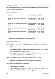 Einführende Informationen Der Kreis Rottweil unterhält zum aktuellen Zeitpunkt keine eigenen Kliniken. Die Versorgung ist durch private Betreiber gesichert. Kommunale Daten (4): - Landrat: Dr. Wolf-Rüdiger Michel (CDU) - Budget des Landkreises (gesamt Stand Haushaltsvolumen: 145,647 Mio. € 2012): Schuldenstand: 3,5 Mio. € - Budget des Landkreises (gesamt Stand Haushaltsvolumen: 146,645 Mio. € Schuldenstand: 2,7 Mio. € 2013): - Budget des Landkreises (gesamt Stand Haushaltsvolumen: 152,185 Mio. € 2014): Schuldenstand: 1,8 Mio. € - Budget des Landkreises (gesamt Stand Haushaltsvolumen: 158,358 Mio. € 2015): Schuldenstand: 1,2 Mio. € 2.2 Internationale und nationale Klimaschutzziele Weltweite Klimaschutzziele: 1992: Weltgipfel in Rio de Jainero (UNCED; UN Conference on Environment and Develop- ment) - Ergebnis war die Agenda 21, die ein globales Aktionsprogramm für das 21. Jahrhun- dert mit Handlungsempfehlungen darstellt. - Einführung der Klimarahmenkonvention (KRK), die Ziele zur Reduzierung des Treib- hausgas-Effektes (THG) festlegt und 1994 in Kraft trat. 1995: Erste UN-Klimakonferenz (COP(Conference of the Parties)-1) in Berlin - Überprüfung, ob die KRK für einen effektiven Klimaschutz ausreichten 1997: Dritte UN-Klimakonferenz (COP-3) in Kyoto - Einführung des Kyoto-Protokolls - Verpflichtung aller Industriestaaten die THG um min. 5 % unter das Niveau von 1990 im Zeitraum von 2008 bis 2012 (erste Verpflichtungsperiode) zu reduzieren 16 21.11.2016
