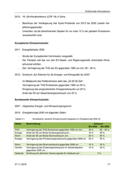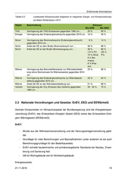 Einführende Informationen Tabelle 2-2: Landesweite Klimaschutzziele festgesetzt im Integrierten Energie- und Klimaschutzkonzep- tes Baden Württemberg in 2013 Objekt Beschreibung Zeitraum: Bis 2020 Bis 2050 THG Verringerung der THG-Emissionen gegenüber 1990 um … 25 % 90 % Energie Verringerung des Endenergieverbrauchs gegenüber 2010 um 16 % 49 % … Strom Verringerung des Stromverbrauchs (Endenergieverbrauch) 6% 14 % gegenüber 2010 um … Strom Anteil der EE an dem Brutto-Stromverbrauch von … 36 % 89 % Strom Anteil der EE an der Brutto-Stromerzeugung von … 38 % 86 % (12 % PV, (25 % 10 % Wind, PV) 8 % Bio- masse, 8 % Was- ser) Wärme Verringerung des Brennstoffeinsatzes zur Wärmebereitstel- 22 % 66 % lung (ohne Stromeinsatz für Wärmezwecke) gegenüber 2010 um … Wärme Verringerung des Endenergieverbrauchs zur Wärmebereit- 22 % 64 % stellung gegenüber 2010 um … Wärme Anteil der EE an der Wärmebereitstellung von … 21 % 88 % Verkehr Verringerung der CO2-Emission des Verkehrs gegenüber 20 - 25 % 70 % 1990 um … 2.3 Nationale Verordnungen und Gesetze: EnEV, EEG und EEWärmeG Zentrale Komponenten im Klimaschutzpaket der Bundesregierung sind die Energieeinspar- verordnung (EnEV), das Erneuerbare Energien Gesetz (EEG) sowie das Erneuerbare Ener- gien Wärmegesetz (EEWärmeG). EnEV: - Wurde aus der Wärmeschutzverordnung und der Heizungsanlagenverordnung gebil- det - Grundlage für viele Berechnungen und Baumaßnahmen (unter anderem ist sie auch Berechnungsgrundlage für den Bedarfsausweis) - EnEV schreibt bautechnische und primärenergetische Standards bei Neubau, Erwei- terung und Sanierung fest - Gilt für Wohngebäude wie für Nichtwohngebäude Energieausweis: 21.11.2016 19