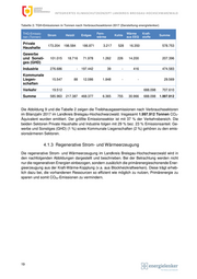 I NT E G R I E R T E S K L I M A SC H U T Z K O N Z E P T L AN D K R E I S B R E I S G A U - H O C H S C H W AR Z W A L D Tabelle 2: TGH-Emissionen in Tonnen nach Verbrauchssektoren 2017 (Darstellung energielenker) THG-Emissio- Fern- Wärme Kraft- Strom Heizöl Erdgas Kohle Summe nen (Tonnen) wärme aus EEQ stoffe Private 173.204 198.584 186.871 3.217 528 16.350 578.753 Haushalte Gewerbe und Sonsti- 101.015 18.716 71.978 1.262 226 14.200 207.396 ges (GHD) Industrie 276.686 - 197.442 39 - 416 474.583 Kommunale Liegen- 15.547 88 12.086 1.848 - - 29.569 schaften Verkehr 19.512 688.098 707.610 Summe 585.963 217.387 468.377 6.365 755 30.966 688.098 1.997.912 Die Abbildung 9 und die Tabelle 2 zeigen die Treibhausgasemissionen nach Verbrauchssektoren im Bilanzjahr 2017 im Landkreis Breisgau-Hochschwarzwald. Insgesamt 1.997.912 Tonnen CO2- Äquivalent wurden emittiert. Der größte Emissionssektor ist mit 37 % der Verkehrsbereich. Die beiden Sektoren Private Haushalte und Industrie folgen mit 29 % bez. 23 % Emissionsanteil. Ge- werbe und Sonstiges (GHD) (1 %) sowie Kommunale Liegenschaften (2 %) gehören zu den emis- sionsärmeren Sektoren. Regenerative Strom- und Wärmeerzeugung Die regenerative Strom- und Wärmeerzeugung im Landkreis Breisgau-Hochschwarzwald wird in den nachfolgenden Abbildungen dargestellt und beschrieben. Bei der Betrachtung werden nicht nur die regenerativen Energien einbezogen, sondern zusätzlich die primärenergieschonende Ener- gieerzeugung aus der Kraft-Wärme-Kopplung (v.a. aus Blockheizkraftwerken). Diese trägt erheb- lich dazu bei, die vorhandenen Ressourcen so effizient wie möglich zu nutzen, Primärenergie zu sparen und somit CO2e-Emissionen zu vermindern. 19