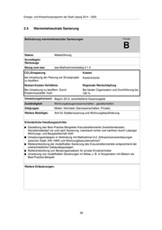 Energie- und Klimaschutzprogramm der Stadt Leipzig 2014 – 2020 2.4 Warmmietneutrale Sanierung Beförderung warmmietneutraler Sanierungen Priorität B Status: Weiterführung Grundlagen/ Werkzeuge Bezug zum eea: eea-Maßnahmenkatalog 2.1.4 CO2-Einsparung Kosten bei Umsetzung der Planung am Einzelprojekt Kostenneutral zu beziffern Nutzen-Kosten-Verhältnis Regionale Wertschöpfung Bei Umsetzung zu beziffern. Durch Bei lokaler Organisation und Durchführung bis Kostenneutralität: hoch 100 % Umsetzungshorizont: Beginn 2013, anschließend Daueraufgabe Zuständigkeit Wohnungsbaugenossenschaften, -gesellschaften Zielgruppe: Mieter, Vermieter (Genossenschaften, Private) Weitere Beteiligte: Amt für Stadterneuerung und Wohnungsbauförderung Erforderliche Handlungsschritte: Darstellung des Best-Practise Beispieles Kreuzstraßenviertel (Investitionskosten, Heizwärmebedarf vor und nach Sanierung, Leerstand vorher und nachher) durch Leipziger Wohnungs- und Baugesellschaft mbH Umsetzungsstrategien in Verbindung mit Maßnahmen 6.2 „Klimaschutzvereinbarungen zwischen Stadt, IHK, HWK und Wohnungsbauunternehmen“ Weiterentwicklung der modellhaften Sanierung des Kreuzstraßenviertels entsprechend der unterschiedlichen Gebäudetypologien Weiterentwicklung von Beratungsansätzen für private Einzelvermieter Umsetzung von modellhaften Sanierungen im Altbau z. B. in Kooperation mit Mietern als Best-Practice-Beispiel Weitere Erläuterungen: 55