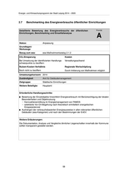 Energie- und Klimaschutzprogramm der Stadt Leipzig 2014 – 2020 2.7 Benchmarking des Energieverbrauchs öffentlicher Einrichtungen Detaillierte Bewertung des Energieverbrauchs der öffentlichen Priorität Einrichtungen, Benchmarking und Einzelfallanalyse A Status: Anpassung Grundlagen/ Werkzeuge Bezug zum eea: eea-Maßnahmenkatalog 2.1.2 CO2-Einsparung Kosten Bei Umsetzung der identifizierten Handlungs- Verwaltungsaufwand schwerpunkte zu beziffern Nutzen-Kosten-Verhältnis Regionale Wertschöpfung Noch nicht zu beziffern Durch Initiierung von Maßnahmen möglich Umsetzungshorizont: 2014 Zuständigkeit Amt für Gebäudemanagement Zielgruppe: Städtische Einrichtungen Weitere Beteiligte: Hauptamt Erforderliche Handlungsschritte: Bewertung der Einzelobjekte hinsichtlich Energieverbrauch mit Berücksichtigung der lokalen Besonderheiten und Objektnutzung ◦ Kennzahlenermittlung im Energiemanagement von FAMOS ◦ selektierte Vor-Ort-Begehung nach theoretisch ermitteltem energetischen Einsparpotenzial Aushängen der verbrauchsbasierten Energieausweise in allen relevanten öffentlichen Gebäuden (eea-Kategorien) und nach den Bestimmungen der EnEV. Weitere Erläuterungen: Die Dokumentation, Analyse und Vergleiche ähnlicher Liegenschaften innerhalb der Kommune sollten transparent gestaltet werden. 58