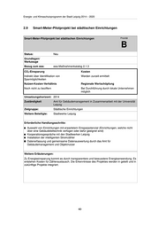 Energie- und Klimaschutzprogramm der Stadt Leipzig 2014 – 2020 2.9 Smart-Meter-Pilotprojekt bei städtischen Einrichtungen Smart-Meter-Pilotprojekt bei städtischen Einrichtungen Priorität B Status: Neu Grundlagen/ Werkzeuge Bezug zum eea: eea-Maßnahmenkatalog 2.1.3 CO2-Einsparung Kosten Indirekt über Identifikation von Werden zurzeit ermittelt Sparmöglichkeiten Nutzen-Kosten-Verhältnis Regionale Wertschöpfung Noch nicht zu beziffern Bei Durchführung durch lokale Unternehmen möglich Umsetzungshorizont: 2014 Zuständigkeit Amt für Gebäudemanagement in Zusammenarbeit mit der Universität Leipzig Zielgruppe: Städtische Einrichtungen Weitere Beteiligte: Stadtwerke Leipzig Erforderliche Handlungsschritte: Auswahl von Einrichtungen mit erwartetem Einsparpotenzial (Einrichtungen, welche nicht über eine Gebäudeleittechnik verfügen oder dafür geeignet sind) Kooperationsgespräche mit den Stadtwerken Leipzig Installation der intelligenten Stromzähler Datenerfassung und gemeinsame Datenauswertung durch das Amt für Gebäudemanagement und Objektnutzer Weitere Erläuterungen: Zu Energieeinsparung kommt es durch transparentere und bewusstere Energieanwendung. Es entstehen Kosten für Zähleraustausch. Die Erkenntnisse des Projektes werden in geteilt und in zukünftige Projekte integriert. 60