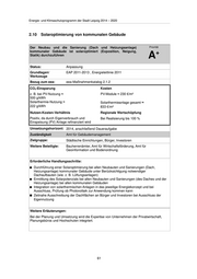 Energie- und Klimaschutzprogramm der Stadt Leipzig 2014 – 2020 2.10 Solaroptimierung von kommunalen Gebäude Der Neubau und die Sanierung (Dach und Heizungsanlage) Priorität kommunaler Gebäude ist solaroptimiert (Exposition, Neigung, + Statik) durchzuführen A Status: Anpassung Grundlagen/ EAP 2011-2013 , Energieleitlinie 2011 Werkzeuge Bezug zum eea: eea-Maßnahmenkatalog 2.1.2 CO2-Einsparung Kosten z. B. bei PV-Nutzung ≈ PV-Module ≈ 230 €/m² 500 g/kWh Solarthermie-Nutzung ≈ Solarthermieanlage gesamt ≈ 222 g/kWh 833 €/m² Nutzen-Kosten-Verhältnis Regionale Wertschöpfung Positiv, da durch Eigenverbrauch und Bei Realisierung bis 100 % Einspeisung (PV) Anlage refinanziert wird Umsetzungshorizont: 2014, anschließend Daueraufgabe Zuständigkeit Amt für Gebäudemanagement Zielgruppe: Städtische Einrichtungen, Bürger, Investoren Weitere Beteiligte: Bauherrenämter, Amt für Wirtschaftsförderung, Amt für Geoinformation und Bodenordnung Erforderliche Handlungsschritte: Durchführung einer Solaroptimierung bei allen Neubauten und Sanierungen (Dach, Heizungsanlage) kommunaler Gebäude unter Berücksichtigung notwendiger Dachaufbauten (wie. z. B. Lüftungsanlagen) Ermittlung des Solarpotenzials bei allen Neubauten und Sanierungen (des Daches und der Heizungsanlage) bei allen kommunalen Gebäuden Integration von solarthermischen Anlagen in das jeweilige Energiekonzept und bei Ausschluss, Prüfung ob Photovoltaik zur Anwendung kommen kann Zeitnahe Ausschreibung der Dachflächen an Bürger und Investoren bei Ausschluss der Eigennutzung Weitere Erläuterungen: Bei der Planung und Umsetzung wird die Expertise von Unternehmen der Privatwirtschaft, Planungsbüros und Hochschulen integriert. 61