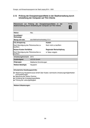 Energie- und Klimaschutzprogramm der Stadt Leipzig 2014 – 2020 2.13 Prüfung der Energieeinspareffekte in der Stadtverwaltung durch Umstellung der Computer auf Thin Clients Pilotversuch zur Prüfung der Energieeinspareffekte in der Priorität Stadtverwaltung durch Umstellung der Computer auf Thin Clients B Status: Neu Grundlagen/ Werkzeuge Bezug zum eea: eea-Maßnahmenkatalog 2.2.4 CO2-Einsparung Kosten Nach Beendigung des Pilotversuches zu Noch nicht zu beziffern beziffern Nutzen-Kosten-Verhältnis Regionale Wertschöpfung Nach Beendigung des Pilotversuches zu In Teilen möglich beziffern Umsetzungshorizont: 2015 Zuständigkeit LECOS GmbH Zielgruppe: Städtische Einrichtungen Weitere Beteiligte: Hauptamt Erforderliche Handlungsschritte: Abstimmung Hauptamt/Lecos GmbH über Kosten, technische Umsetzungsmöglichkeiten und Auswirkungen Beachtung der Rollout-Termine Ermittlung der Energieeinspareffekte Prüfung der Leistungsfähigkeit Weitere Erläuterungen: 64