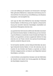 - er die nach Auffassung der Gutachter vom Kirchenrecht in derartigen Fällen geforderten Maßnahmen, insbesondere die Einleitung einer kir- chenrechtlichen Voruntersuchung und die Mitteilung an die Glaubens- kongregation, nicht durchgeführt hat, - nach Lage der Akten keine Maßnahmen des damaligen Erzbischofs Kardinal Döpfner mit Blickrichtung auf die möglichst umfassende Be- treuung des namentlich bekannten Geschädigten einschließlich ent- sprechender Hilfsangebote erkennbar sind, - aus gutachterlicher Sicht keinerlei zielführende Aktivitäten des damali- gen Erzbischofs Kardinal Döpfner mit Blickrichtung auf eine Verhinde- rung ohne Weiteres zu erwartender erneuter Kontakte des Priesters mit Kindern und Jugendlichen und davon ausgehender Gefahren für diese erkennbar sind, der Priester vielmehr ohne spürbare Einschränkungen weiterhin priesterlich tätig sein konnte, - für die Gutachter ebenfalls zu keinem Zeitpunkt Aktivitäten des dama- ligen Erzbischofs Kardinal Döpfner mit dem Ziel erkennbar sind, die Ursachen für das Verhalten des Priesters zu ergründen und diesem Verhalten entgegenzuwirken und dadurch nach Möglichkeit (weitere) Geschädigte zu verhindern, - er den kirchlichen und priesterlichen Interessen nach dem Dafürhalten der Gutachter damit deutlich den Vorrang gegenüber den Belangen des Geschädigten eingeräumt hat. - 674 -