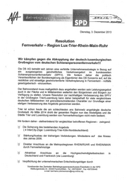 Dienstag, 3. Dezember 2013 Resolution Fernverkehr - Region Lux-Trier-Rhein-Main-Ruhr Wir kämpfen gegen die Abkopplung der deutsch-luxemburgischen Großregion vom deutschen Schienenpersonenfernverkehr!!! Die DB AG betreibt seit Jahren eine verfehlte Unternehmensstrategie in Bezug auf ein ausgewogenes ganzheitliches Verkehrsangebott im bundesweiten Schienenpersonenfernverkehr (SPFV). Wir fordern daher .die politisch Verantwortlichen der Bundesregierung als Eigentümer des DB Konzerns auf, auf die restriktive und einseitige gewinnorientierte Verkehrsplanung in Fernverkehr - notfalls gesetzgeberisch - einzuwirken. Der Bahnvorstand muss maßgeblich dazu angehalten werden sein Leistungsangebot auch in der Fläche und in Mittelzentren weiterhin den Bürgerinnen und Bürgern zur Verfügung zu stellen. Unsere Resolution zur nachhaltigen Verbesserung .des SPFV in der Großregion Trier/Luxemburg kann daher beispielhaft für viele vergleichbare deutschen Mittelzentren mit grenzüberschreitenden Charakter zur Grundlage einer stetigen Verbesserung des Angebots genommen werden. | Trier ist schon heute die am schlechtesten ans Bahnnetz angehängte deutsche Großstadt. Ab Mitte 2014 droht der gesamten Region nun das Abstellgleis und die Städte Trier und Luxemburg werden von Fernverkehrszügen nicht mehr bedient. Wir fordern daher - stellvertretend für vergleichbar betroffenen Regionen - zwingend: &% Die Sicherung des bestehenden Angebots (4 InterCity-Züge: Luxemburg-Trier-Köln-Norddeutschland) % Stärkung/Ausbau der bisherigen Verbindungen. Mindestens auf das Niveau des Jahres 2006. % Direkter Anschluss an die Metropolregionen RHEIN/RUHR und RHEIN/MAIN durch Fernverkehrszüge % Attraktivier Anschluss an die Hochgeschwindigkeitsstrecken in Deutschland und Frankreich (via Luxemburg) © Verpflichtung der unternehmerischen Entscheidungsträger durch ‘Vorsitzender des Zentralen Betriebsgruppenausschusses Eisenbahn in der SPD Weilburgerstraße’24 , 60326 Frankfurt/Main , Tel. +697536267 , Fax +697536449 e-mail: karl-heinz.zimmermann@evg-online.org
