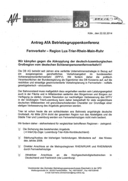 _ Köln ‚ den 22.02.2014 Antrag AfA Betriebsgruppenkonferenz Fernverkehr - Region Lux-Trier-Rhein-Main-Ruhr Wir kämpfen gegen die Abkopplung der deutsch-luxemburgischen Großregion vom deutschen Schienenpersonenfernverkehr!!! Die DB AG betreibt seit Jahren eine verfehlte Unternehmensstrategie in Bezug auf ein. ausgewogenes ganzheitliches Verkehrsangebot im bundesweiten Schienenpersonenfernverkehr (SPFV). Wir fordern daher die politisch Verantwortlichen der Bundesregierung als Eigentümer des DB Konzerns auf, auf die restriktive und einseitige gewinnorientierte Verkehrsplanung in Fernverkehr - notfalls gesetzgeberisch - einzuwirken. Der Bahnvorstand muss maßgeblich dazu angehalten werden sein Leistungsangebot auch in der Fläche und in Mittelzentren weiterhin den Bürgerinnen und Bürgern zur Verfügung zu stellen. Unsere Resolution zur nachhaltigen Verbesserung des SPFV in der Großregion Trier/Luxemburg kann daher beispielhaft für viele vergleichbare deutschen Mittelzentren mit grenzüberschreitenden Charakter zur Grundlage « einer stetigen Verbesserung des Angebots genommen werden. Trier ist schon heute die am schlechtesten ans Bahnnetz angehängte deutsche Großstadt. Ab Mitte 2014 droht der gesamten Region nun das Abstellgleis und die Städte Trier und Luxemburg werden von Fernverkehrszügen nicht mehr bedient. Wir fordern daher - stellvertretend für vergleichbar betroffenen Regionen - zwingend: & Die Sicherung des bestehenden Angebots ( 4 InterCity-Züge: Luxemburg-Trier-Köln-Norddeutschland) % Stärkung/Ausbau der bisherigen Verbindungen. Mindestens auf das Niveau des Jahres 2006. % Direkter Anschluss an die Metropolregionen RHEIN/RUHR und RHEIN/MAIN durch Fernverkehrszüge G Attraktiver Anschluss an die Hochgeschwindigkeitsstrecken in Deutschland und Frankreich (via Luxemburg) Vorsitzender des Zentralen Betriebsgruppenausschusses Eisenbahn in der SPD Weilburgerstraße 24 , 60326 Frankfurt/Main , Tel. +697536267 , Fax +697536449 e-mail: karl-heinz.zimmermann@evg-online.org